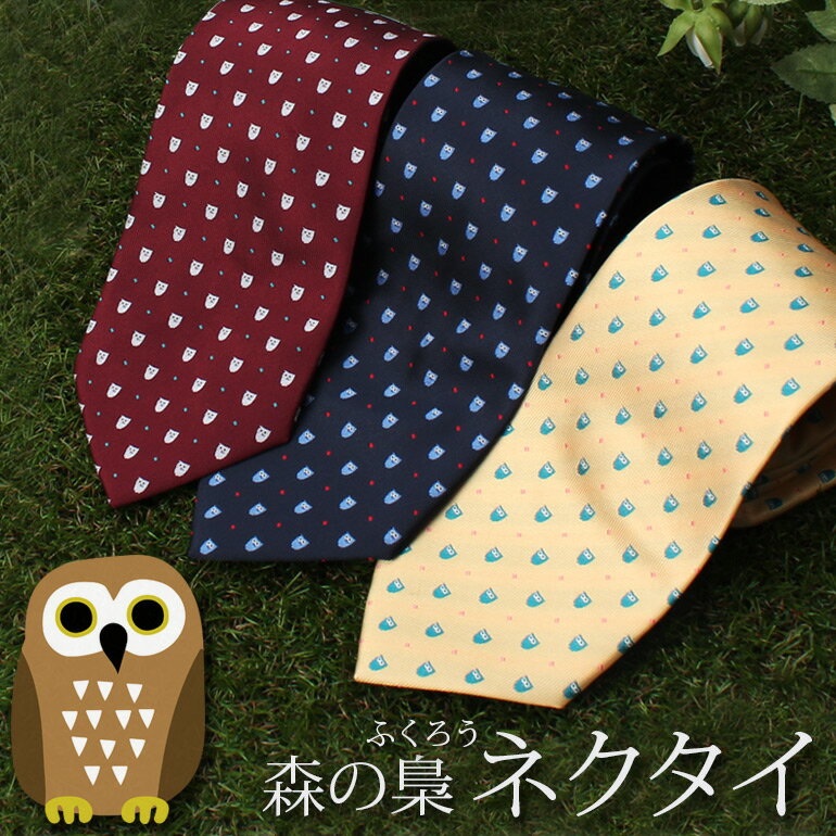 \14.15日はポイント2倍確定/ ネクタイ ふくろう かわいい柄 ラッキーアイテム レギュラーネクタイ フクロウ 梟 鳥 動物 アニマル 獣医 ペット モチーフ イラスト シルエット 可愛い ポップ オシャレ 福 縁起物 長寿 お祝い プレゼント ギフト 贈り物 洗える [M便 1/5]