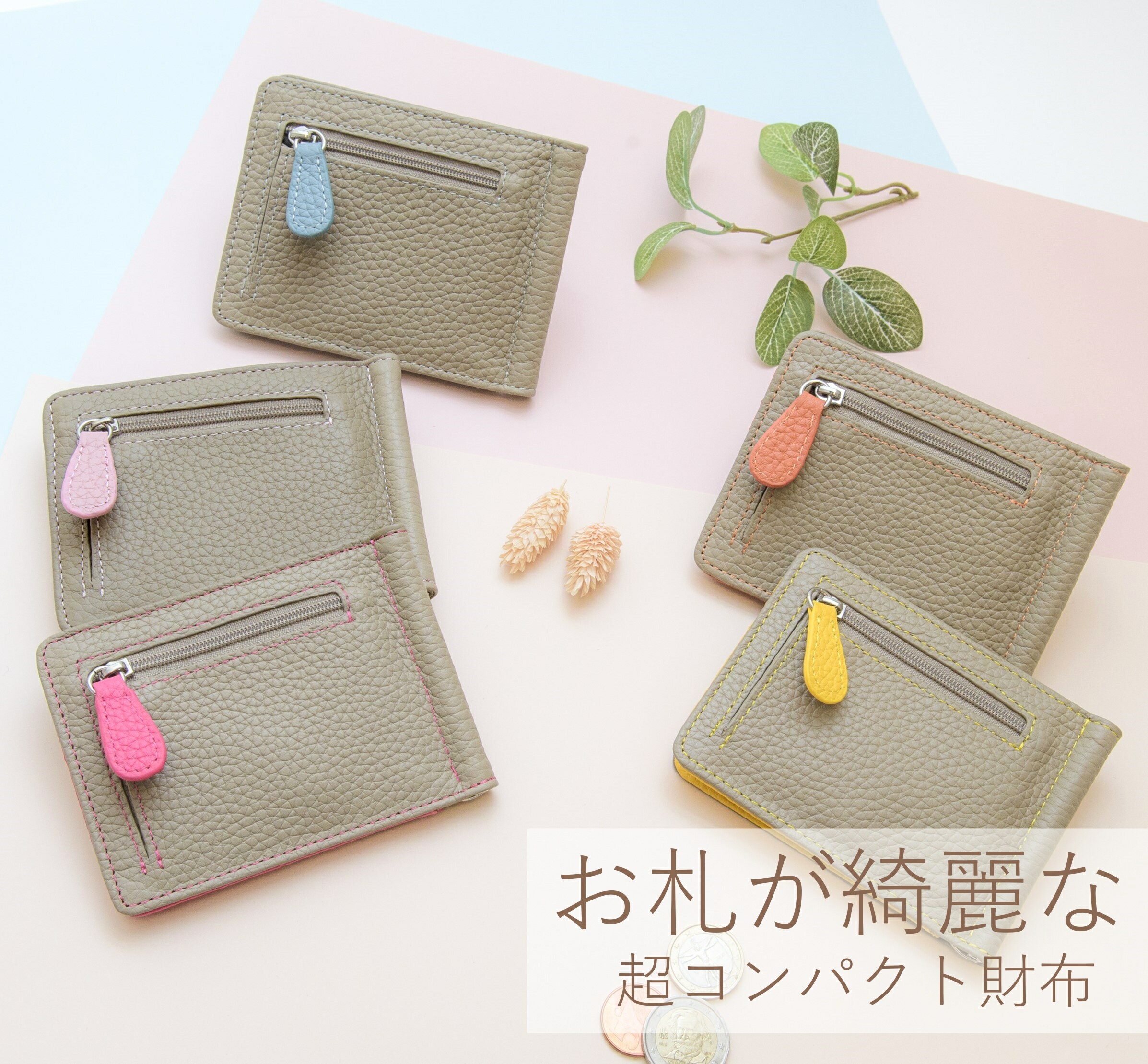 ■abientot おすすめ、マネークリップウォレット(二つ折り財布) 1.カラーリングも可愛いアビアントで人気の売れ筋アイテム 革製で薄く使い易い色の綺麗な財布 かさばらず小銭もカードもお札も入れられる!実用的でデザインも可愛い、必要最低限の紙幣と数枚のカードが入るミニ財布 パーティーバッグやクラッチなどの小さめバッグに入る、コンパクトでシンプルなデザインのウォレット 高品質のシュリンクレザーは汚れにくい上質素材、傷が目立ちにくく、使い込むほどに手になじみます。